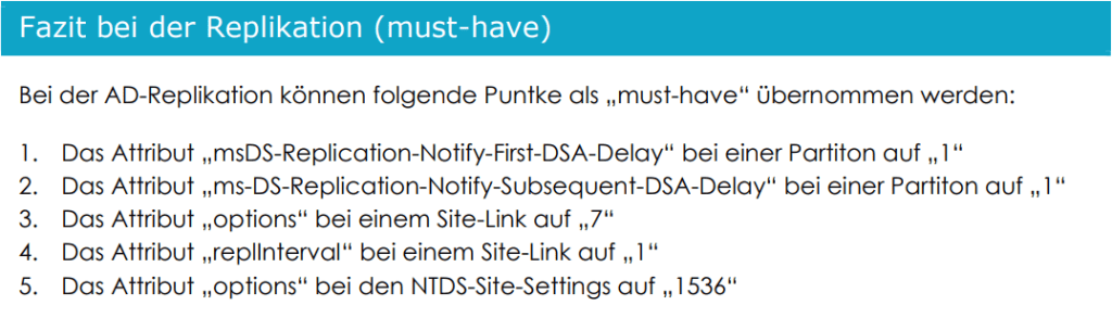 - msDS-Replication-Notify-Subsequent-DSA-Delay („<not set>“ = Default = 3 Sekunden)