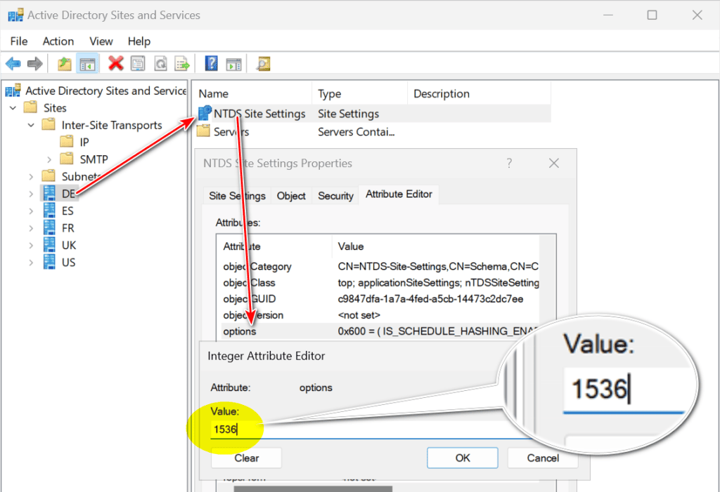 - replInterval auf „1“: das kann nur über den Attributeditor gesetzt werden, da die DLL von der dssite.msc keine Integer kleiner als 15 akzeptiert. Es wird nun ein Mal pro Minute repliziert, ob Änderungen vorliegen oder nicht.