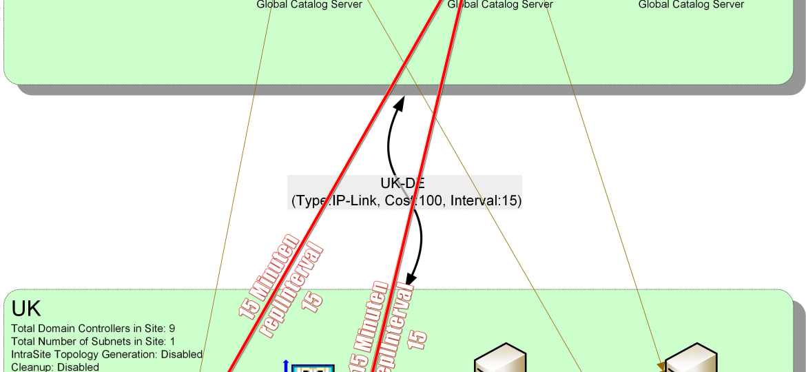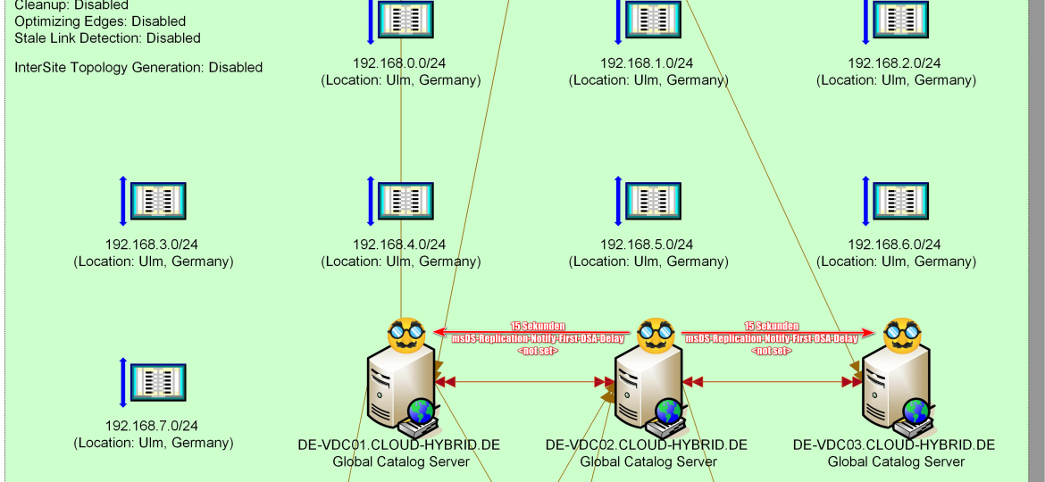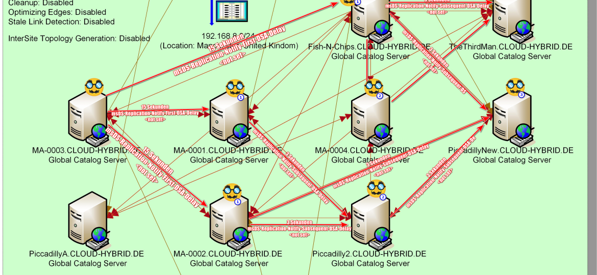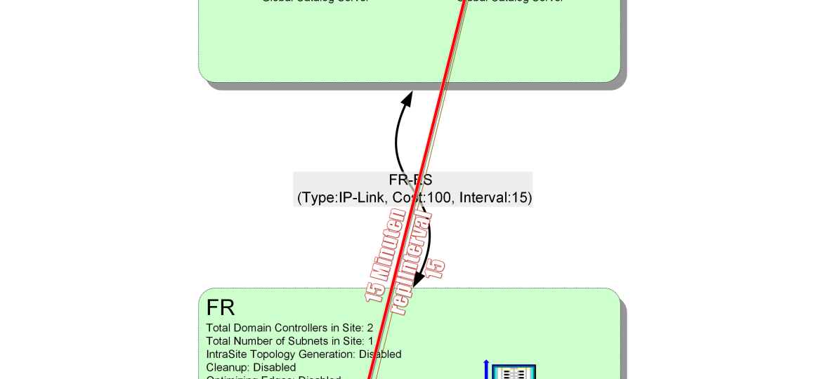 Das ist viel, viel zu langsam. Bis zu einer Stunde Latenz um ein AD-Objekt oder eine AD-Änderung, macht ja keinen Unterschied, über fünf Sites zu replizieren.