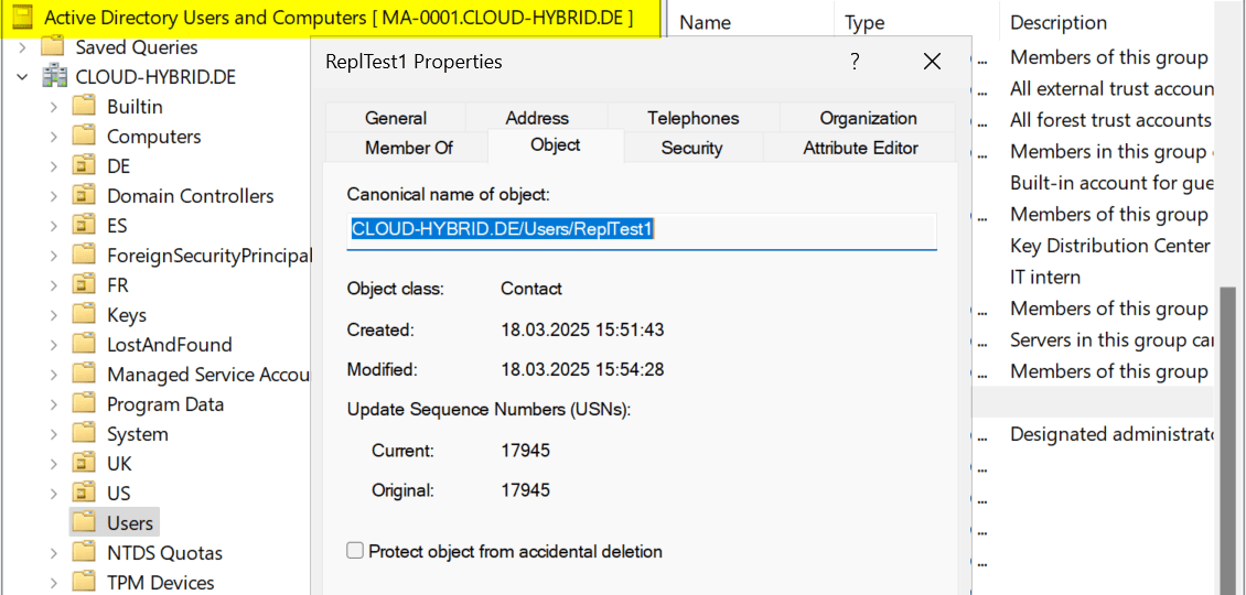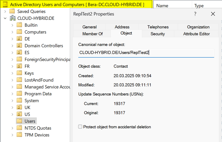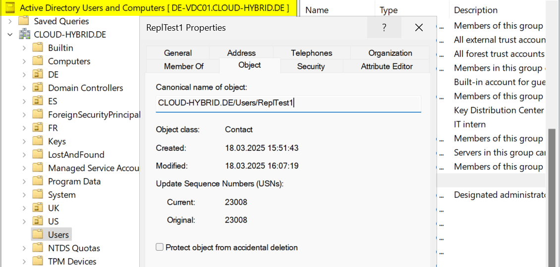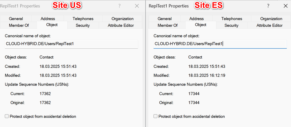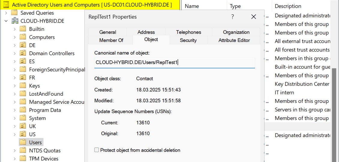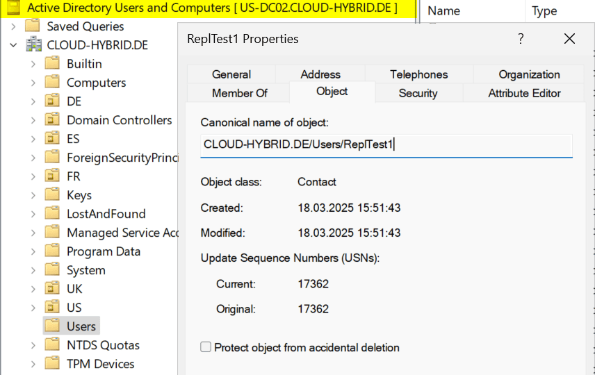 - Site US: 15 Sekunden (Replikation von US-DC01 auf US-DC02)